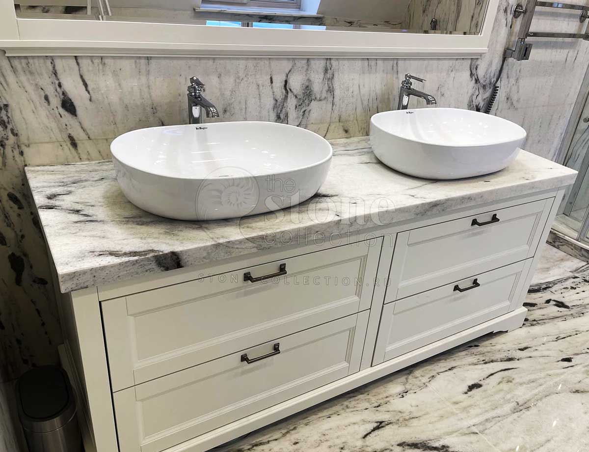 Столешница и фартук из белого мрамора в ванной комнате в Москве.Белый мрамор добывают в разных странах: в Италии, Греции, Турции, Иране, Бразилии, Испании, Китае и других. Каждый сорт отличается цветом, рисунком и структурой. Среди самых популярных видов слэбов белого мрамора: Calacatta, Statuario, Bianco Carrara, Calacatta Oro, Thassos, Volakas, Arabescato, Panda White, Sivec, Bianco Namibia и многие другие.